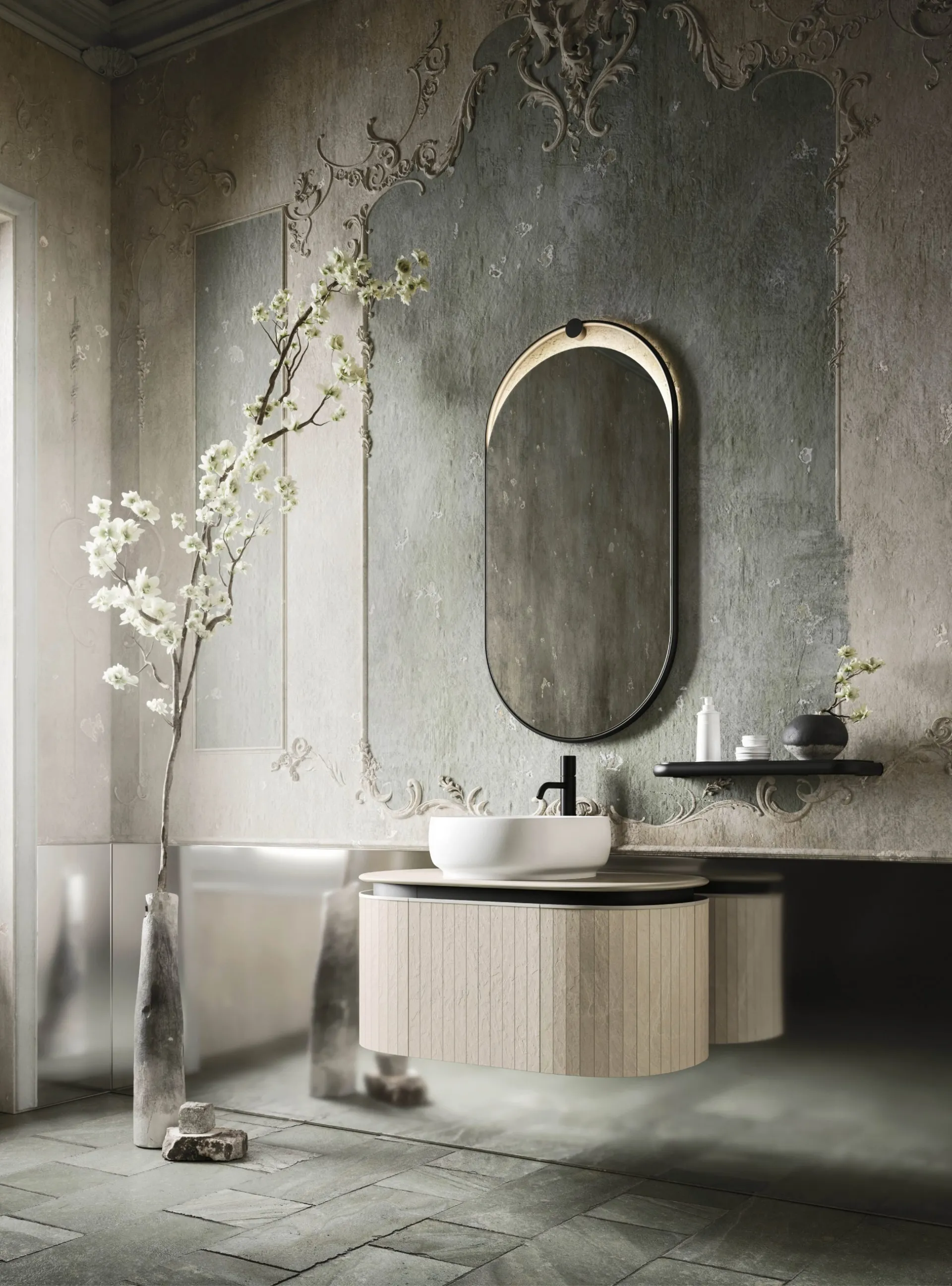 mobili bagno sospesi in gres del brand Arbi: clicca e scopri l'arredo bagno design Almond 01 per la stanza del benessere.