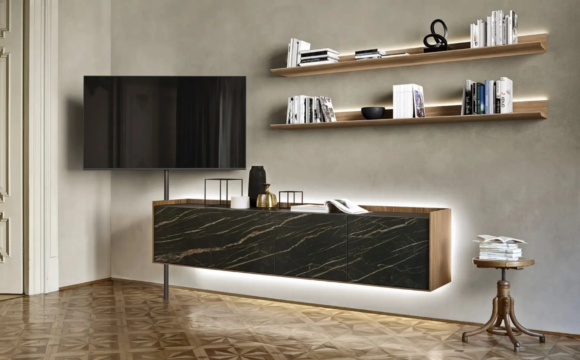 Clicca e scopri il modello Tv Video Sangiacomo: questo mobile per la televisione in legno è tra le più originali soluzioni per il soggiorno.